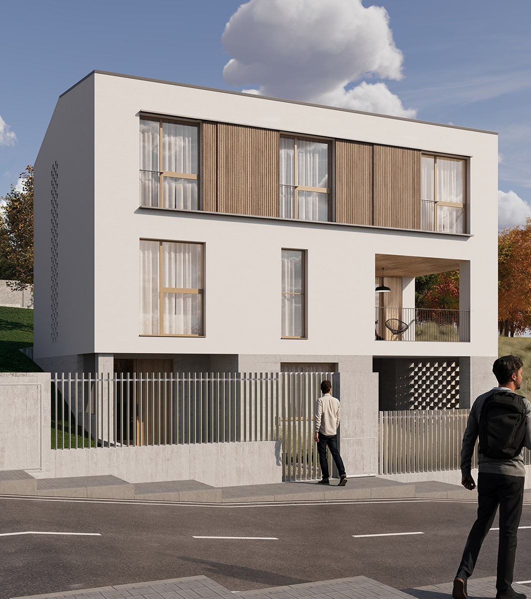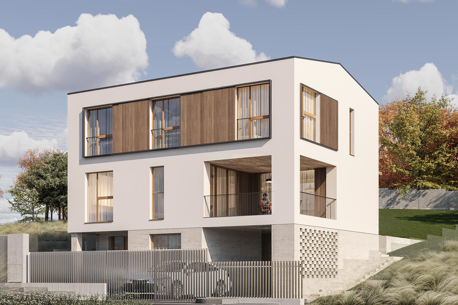 Volumul simplu al casei este articulat în trei registre orizontale. Demisolul este finisat cu beton aparent, conferindu-i un caracter robust și modern, în timp ce restul fațadelor îmbină lemnul termotratat cu tencuiala decorativă, pentru a obține un aspect cald și contemporan. Casa este gândită conform standardelor nZEB (Nearly Zero Energy Building), fiind echipată cu instalații moderne, panouri fotovoltaice și panouri solare pe acoperișul orientat spre sud, precum și cu un sistem de ventilare cu recuperare de căldură. Astfel, proiectul asigură un consum energetic redus și confort ridicat, având în vedere atât nevoile familiei, cât și impactul asupra mediului.